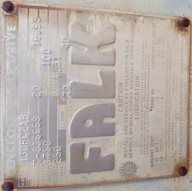 250hp Falk Gearbox, Ratio 16.95, Model 130FC2AB, Input RPM 1750, Output RPM 100, Service Factor 1.31, M.O. 7-836669.