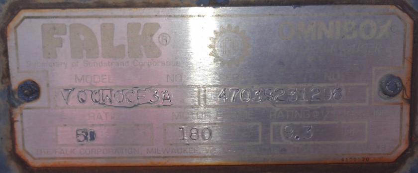 9.3hp Gearbox, Falk, Model 700W0CF3A, Serial # 47039231296, Ratio 50, Motor Frame 180, Rating HP 9.3.
