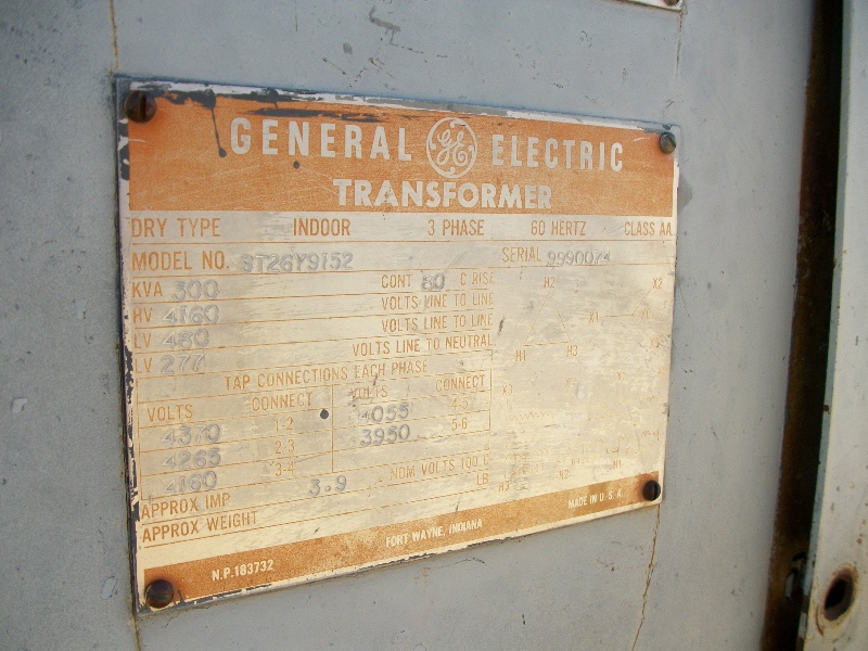 300 KVA Transformer, General Eletric, 300 KVA, 4160 HV, 480 / 277 LV, Dry Type, Indoor, 3 Phase, 60 Hertz, Class AA, Model # 9T26Y9152, Serial # 9990074.