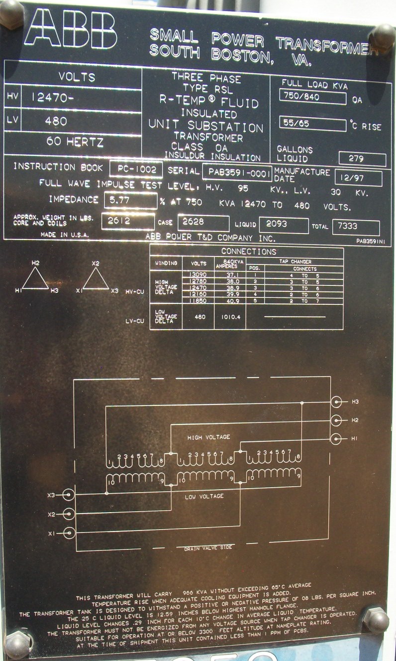 750 KVA Transformer, ABB, 750kva, 12470 HV, 480 LV, Date 12-97.