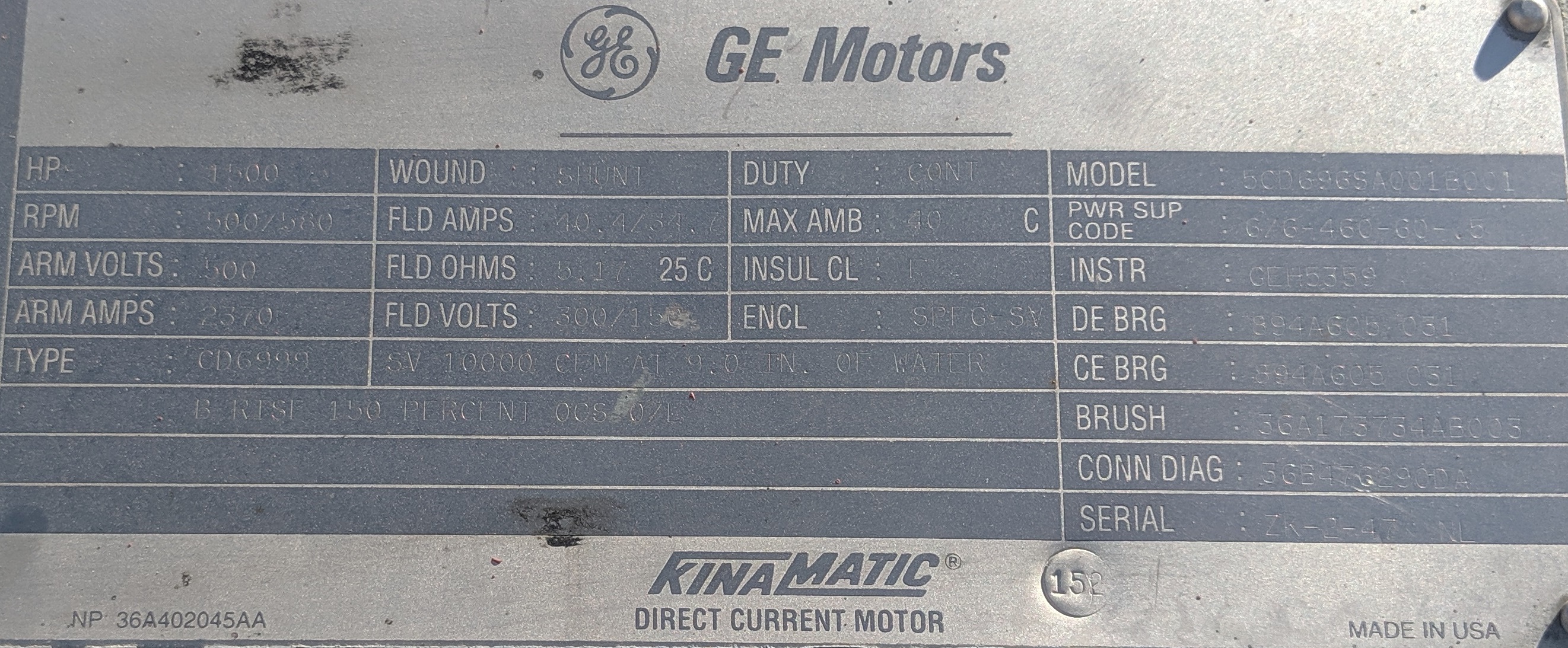 1,500hp Motor, GE DC Motor, 1500 HP, 500/580 RPM, 500 Volts Arm, 2370 Amps Arm, 300/150 Volts Field, 40.4/34.7 Fiel Amps, Shunt Wound