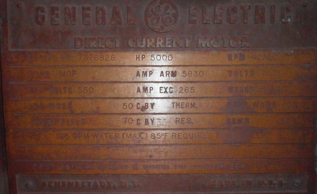 5,000hp Motor, GE, DC Motor, 40 / 80 RPM, 700 Volts, Type MCF, Exc Volts 550, Exc Amps 265, Amp Arm 5830, Wound Shunt